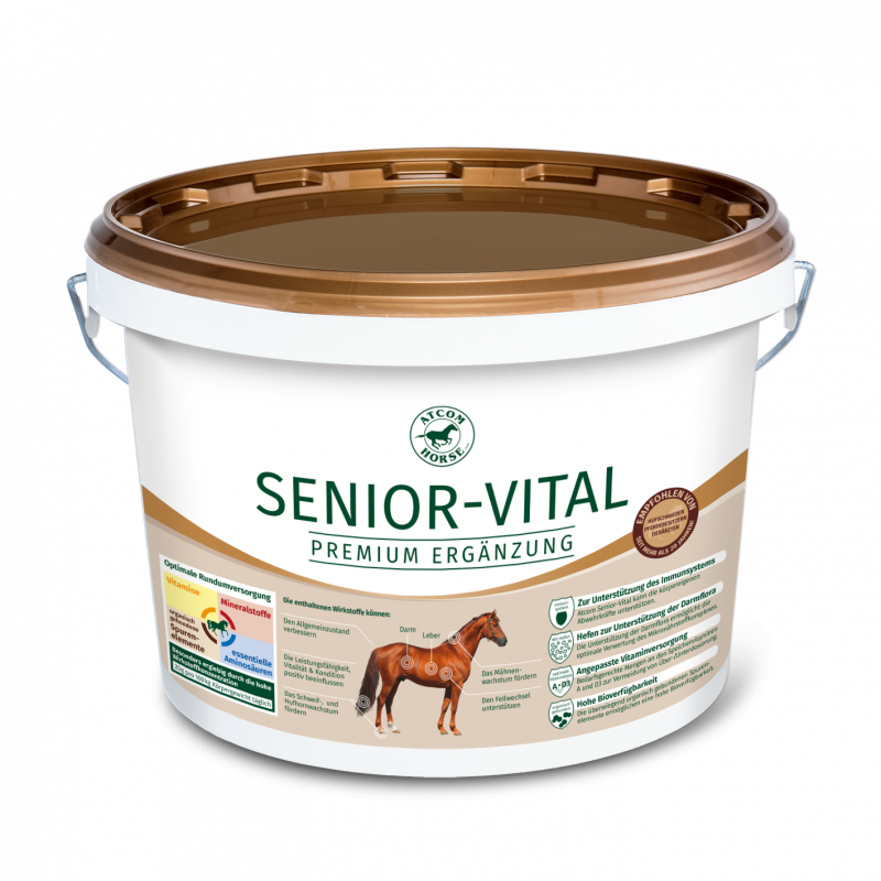 Optimale Versorgung mit Mineralstoffen, Vitaminen, Spurenelementen, Aminosäuren und natürlichen Vitalstoffen abgestimmt auf die hohen Ansprüche des älteren Pferdes