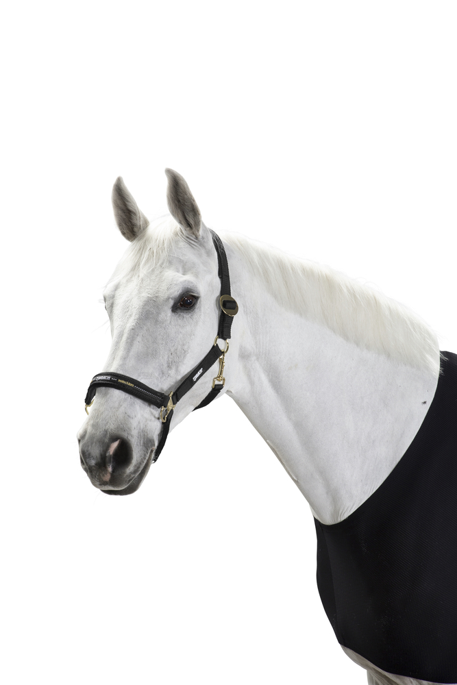 Das Qualitätshalfter aus reißfestem Gurtbandaufwendiges Nasenband passend zur Kollektionweiche Nasen-und Genickpolsterungzuverlässiger Schiebeschnallenverschluss linksvermessingte Metallbeschläge