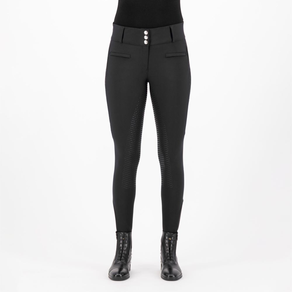 Leichte, weiche und pflegeleichte Reithose Elastisches Markenband oben an der Seitennaht 2 einzelne Leistentaschen vorne Hoher Bund mit 3 Haken und Ösen und Gürtelschlaufen Sehr elastischer Stoff für aktiven Tragekomfort