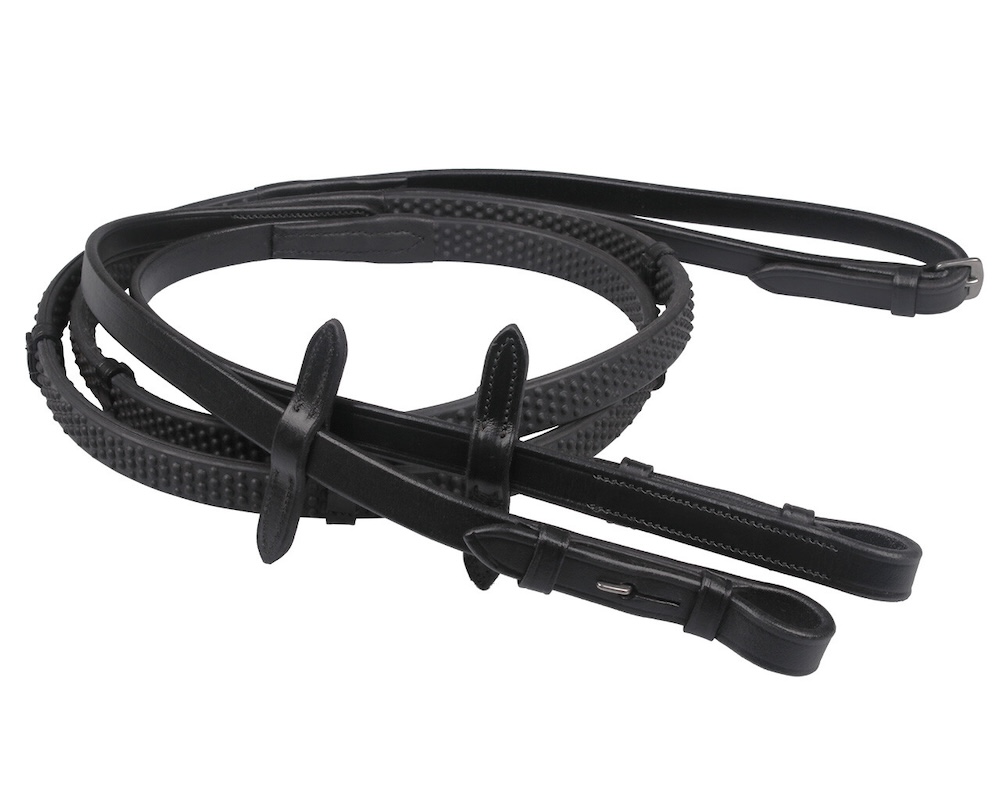 Rutschfeste Gummizügel mit Stops und Noppen für einen guten Halt. Sie sind mit Leder, Martingalstoppern und Blindschnallen ausgestattet.Material: Gummi, LederMaterial Kurzwaren: rostfreier Edelstahl Rutschfeste Gummizügel mit Stoppern und Knöpfen Mit Leder veredelt Mit Martingalstoppern Ausgestattet mit Blindschnallen Breite der Zügel: 15 mm Full = Gesamtlänge 280 cm